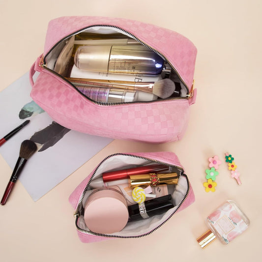 2 Pieces Large Checkered Makeup Bag Cosmetic Bag for Women Travel Toiletry Make up Brush Bag Pack Organizer Travel Accessories for Women (Pink)
